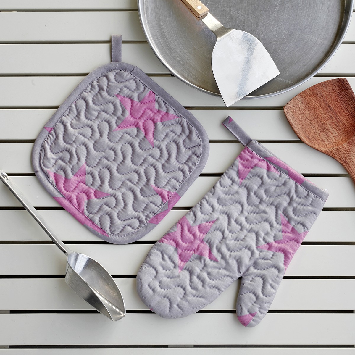 Σετ κουζίνας Πιάστρα & Γάντι Star Girl, εμπριμέ, σε γκρι φούξια αποχρώσεις. Δίνει στυλ & προστατεύει από τα καψίματα κατά το μαγείρεμα.