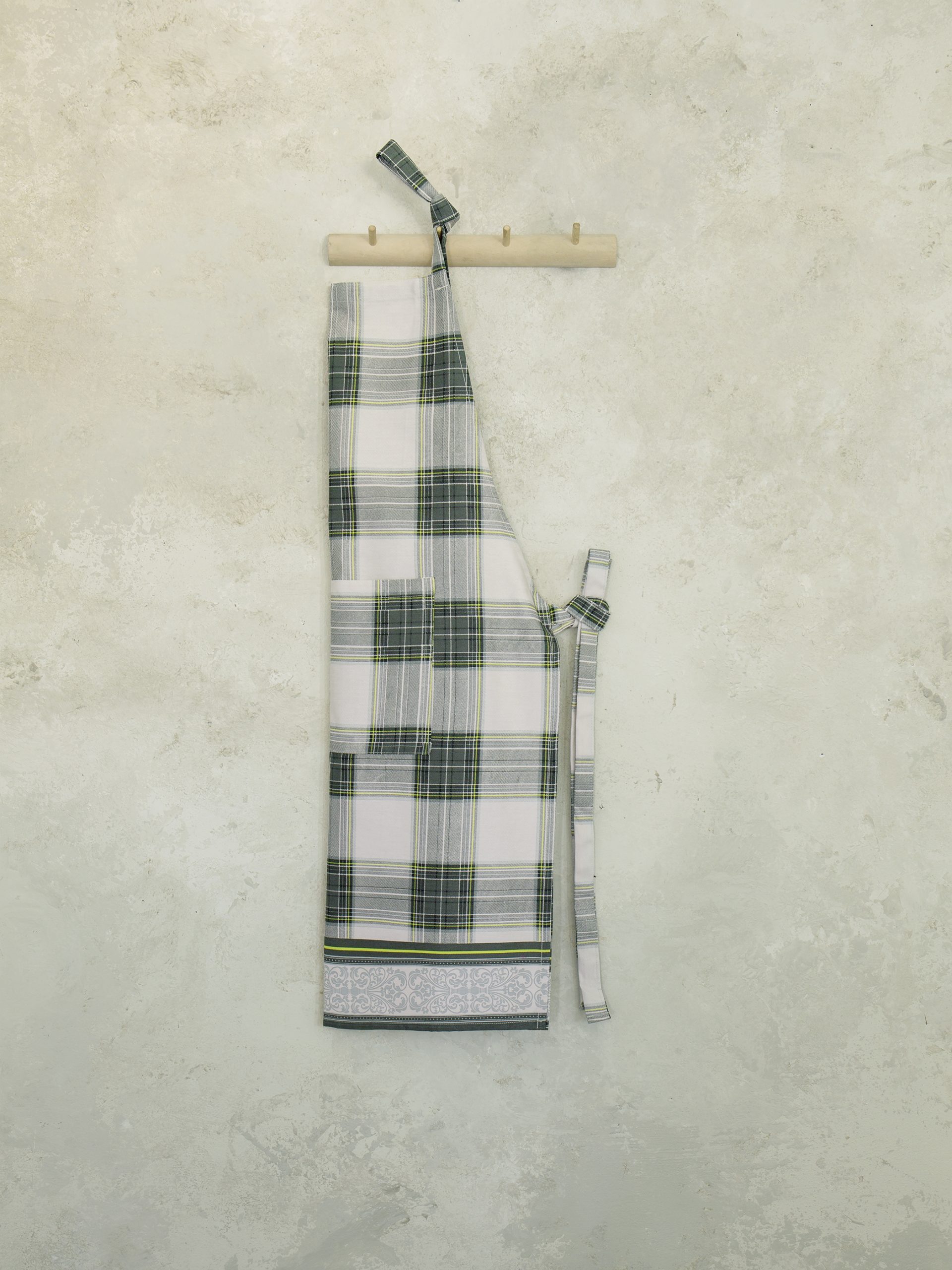 Η ποδιά Royal συνδυάζει τις όμορφες αποχρώσεις του πράσινου με το ανοιχτό γκρι που ταιριάζουν τέλεια με το διαχρονικό καρό της σχέδιο. Μια διακριτική γεωμετρική φάσα στολίζει τιο τελείωμά της, δίνοντάς της μια extra φινέτσα. Οι απλές γραμμές και οι ουδέτεροι χρωματισμοί της δίνουν την δυνατότητα να τη συνδυάσετε με πολλά διαφορετικά χρώματα. Ένα σχέδιο ιδανικό για όσους αγαπούν την απλότητα και το σκανδιναβικό στιλ στη διακόσμηση του σπιτιού. Συνδυάστε τη με ασορτί γάντι και πιάστρα κουζίνας για ένα ολοκληρωμένο look.