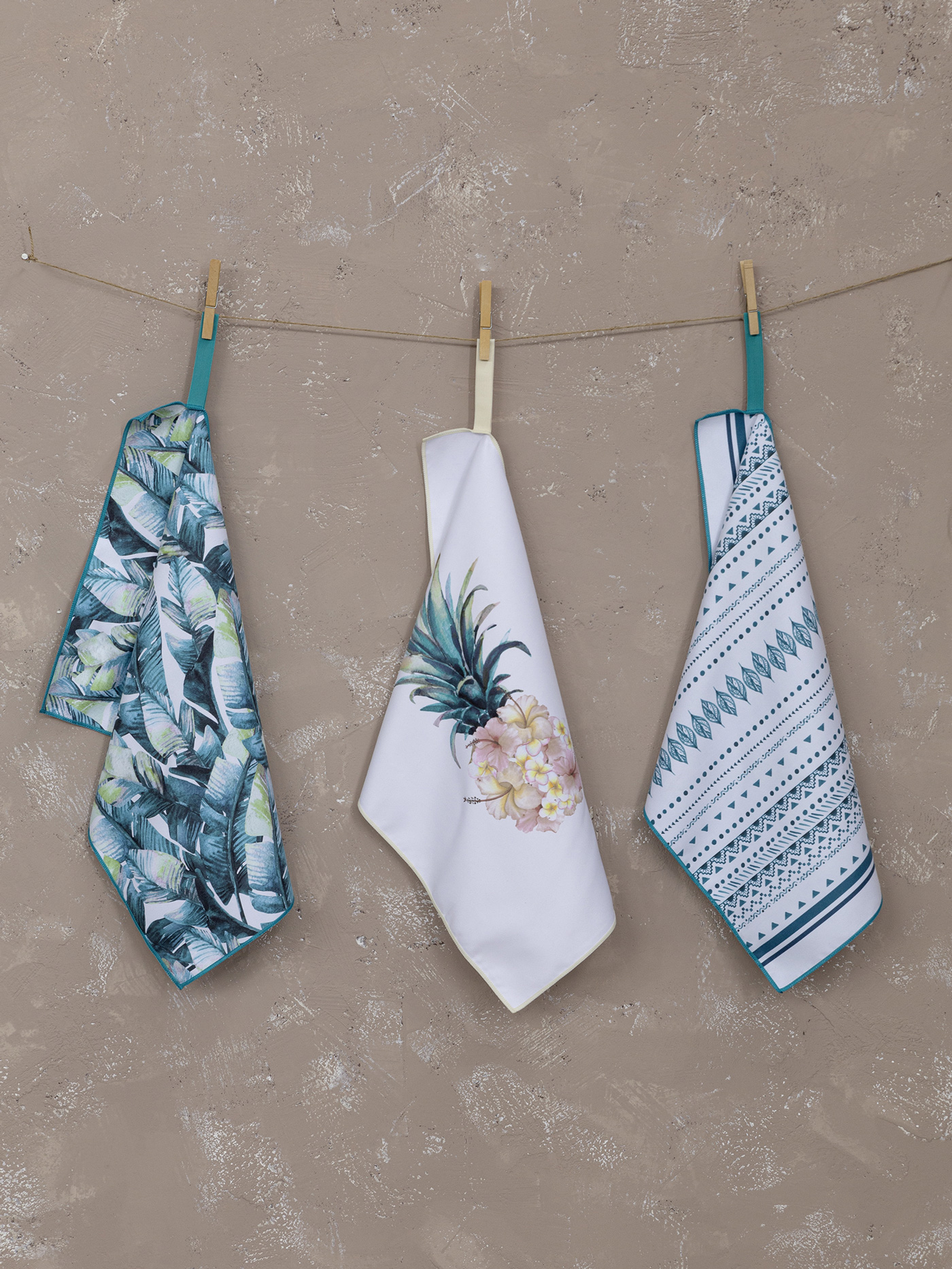 Οι πετσέτες κουζίνας Zahara είναι διπλής όψης. Μονόχρωμες από την μία πλευρά, ενώ από την άλλη έχουν υπέροχα boho σχέδια με την τεχνική της νερομπογιάς που κάνουν κάθε πετσέτα να μοιάζει με ένα ξεχωριστό έργο τέχνης. Συνδυάζουν τη λευκή βάση με όλες τις αποχρώσεις του μπλε με μικρή συμμετοχή του πράσινου και του ροζ στην χρωματική παλέτα του σετ. Είναι οι διαφορέτικές και ποιοτικές πετσέτες κουζίνας που θα φέρουν την boho-chic αισθητική στον χώρο.