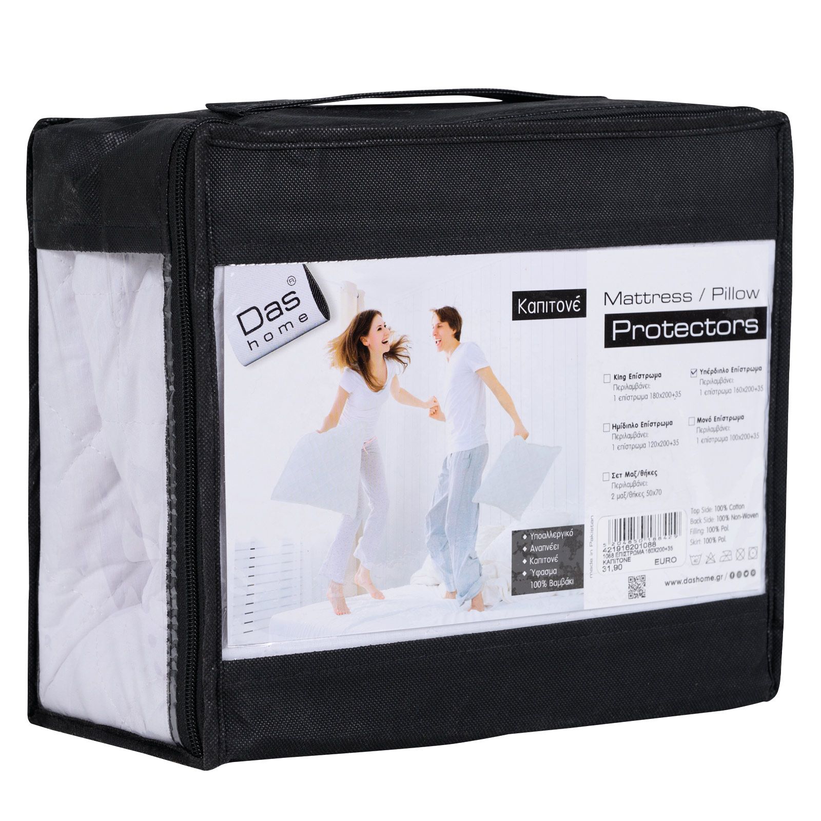 Προστατεύστε το στρώμα σας από σκόνη και λεκέδες και δημιουργήστε ένα καθαρό περιβάλλον για τον ύπνο σας. Επίστρωμα από ύφασμα καπιτονέ βαμβακερό προκειμένου να επιτρέπει τη φυσική αναπνοή του σώματος. Το εσωτερικό του από υψηλής ποιότητας Hollowfiber, ενώ είναι από non-woven για άνεση και προστασία. Διατίθεται σε διάσταση 160x200+35cm.Σύνθεση: 100% Βαμβάκι. Επίστρωση: πολυεστερική βάτα. Kάτω μέρος: non-woven Οδηγίες Φροντίδας: Πλύσιμο στους 40°C. Όχι σιδέρωμα. Όχι χρήση χλωρίου ή λευκαντικού. Χρήση στεγνωτηρίου σε χαμηλή θερμοκρασία. Όχι στεγνό καθάρισμα.