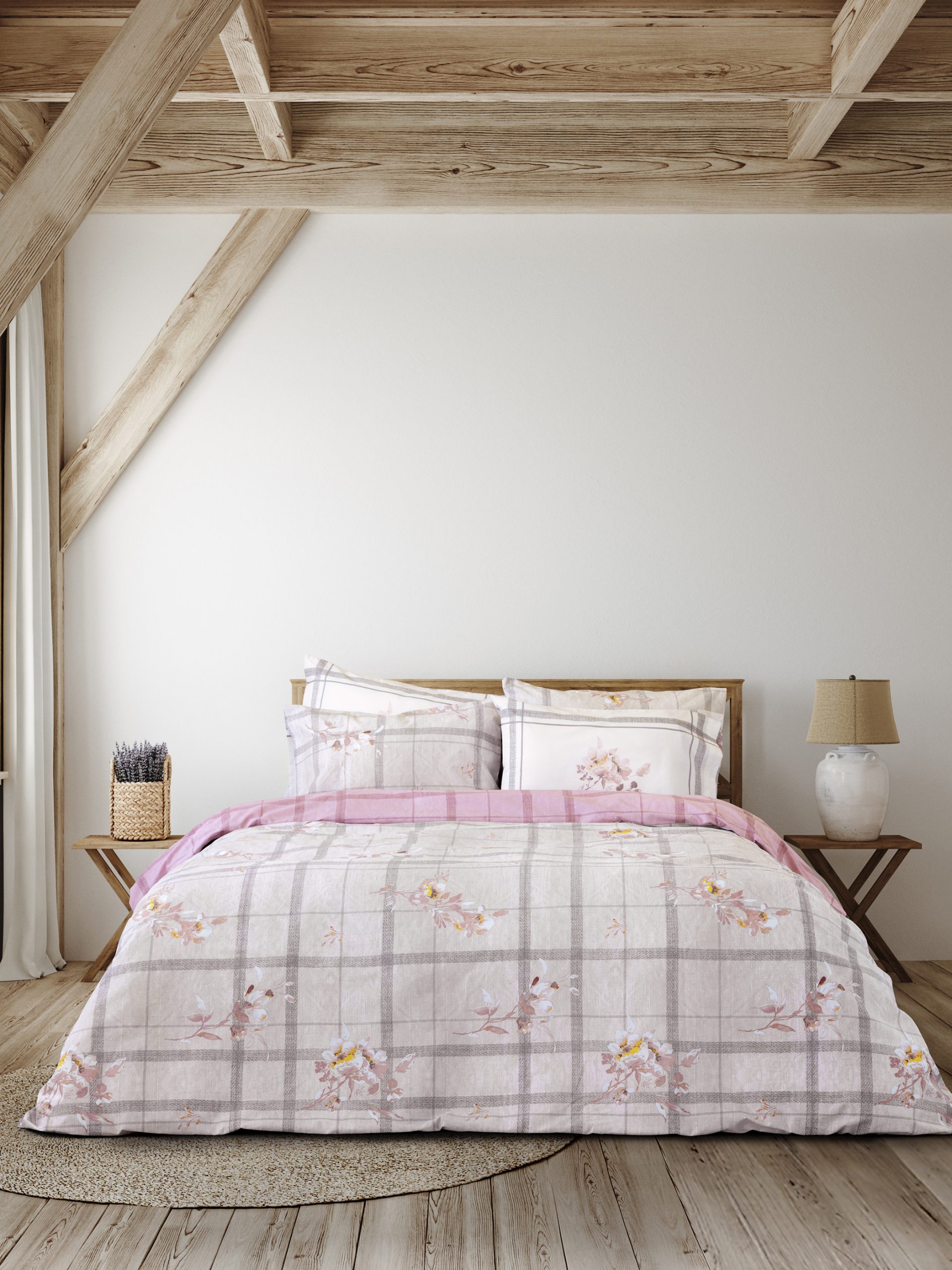 Το βαμβακερό σετ παπλωματοθήκης Reimon έχει καρό σχέδιο σε ροζ και απαλές μωβ αποχρώσεις, εμπλουτισμένο με όμορφα λουλούδια σε ροζ και κίτρινο χρώμα που προσθέτουν μια κομψή και ρομαντική αίσθηση. Οι μαξιλαροθήκες έχουν πάνελ σχέδιο στην μια τους όψη, όπου κυριαρχεί το όμορφο μπουκέτο λουλουδιών πάνω σε λευκό φόντο, ενώ η δεύτερη όψη της είναι ίδια με την πανω όψη της παπλωματοθήκης ώστε να έχετε την δυνατότητα επιλογής στρωσίματος. Το σετ έχει ένα κλασικό και ταυτόχρονα μοντέρνο ύφος που μπορεί να ταιριάξει σε διάφορα διακοσμητικά στυλ υπνοδωματίου.
