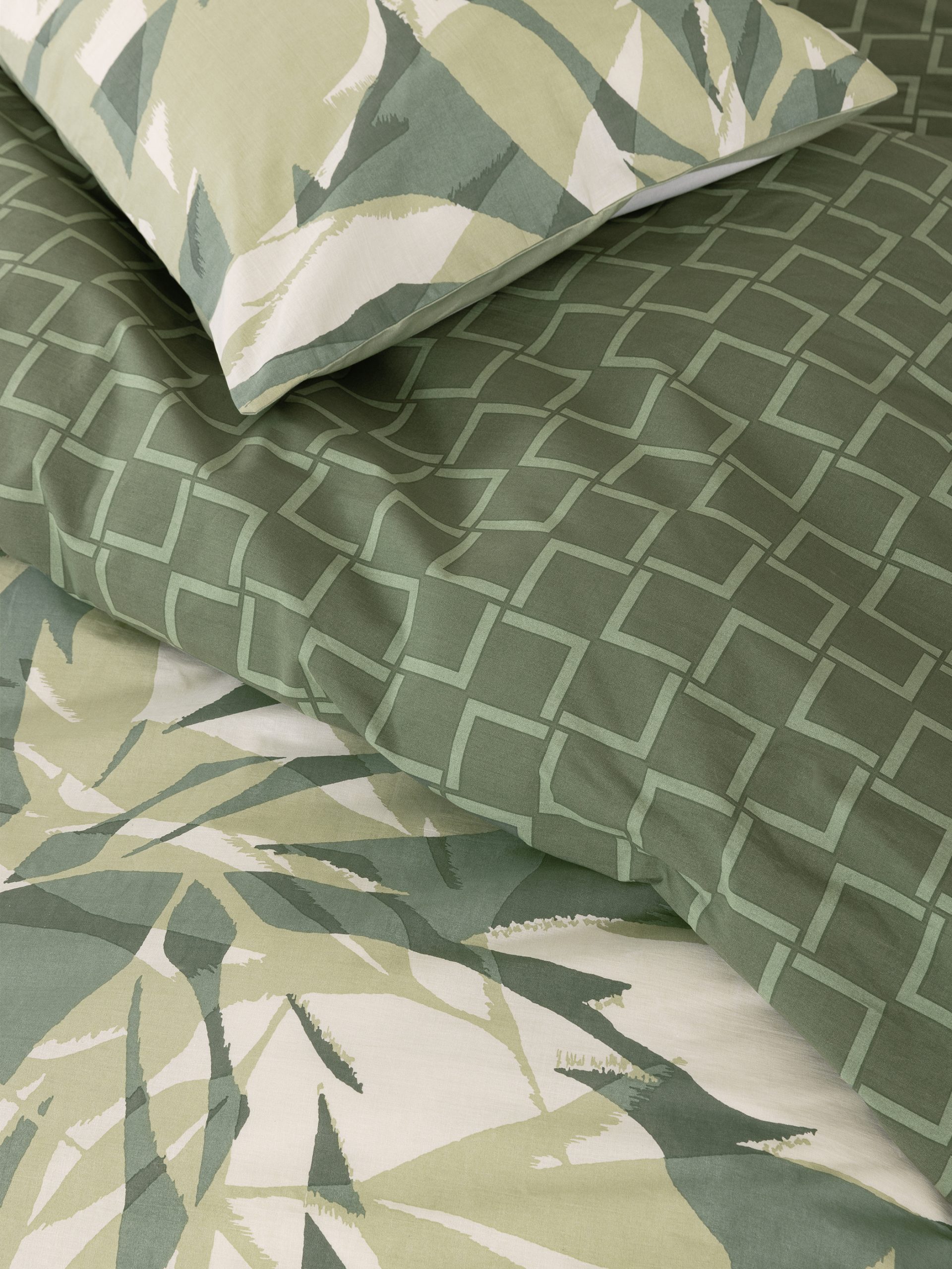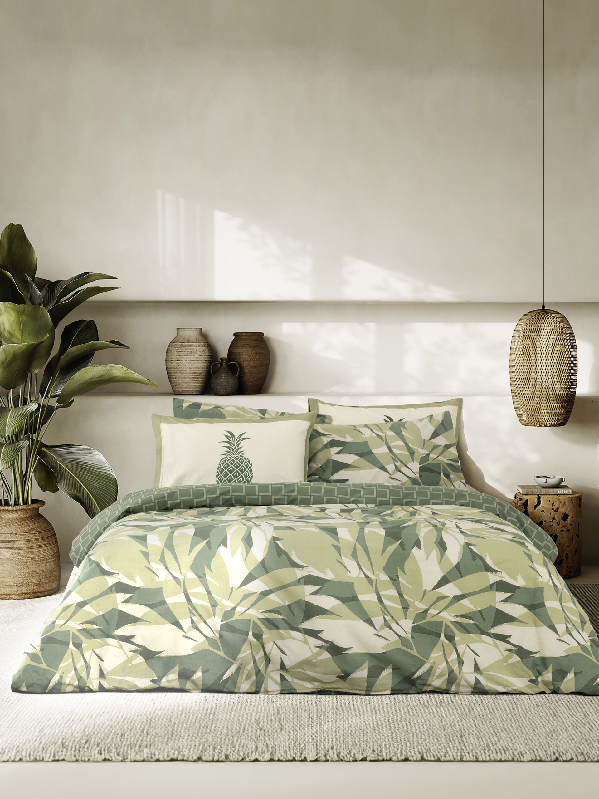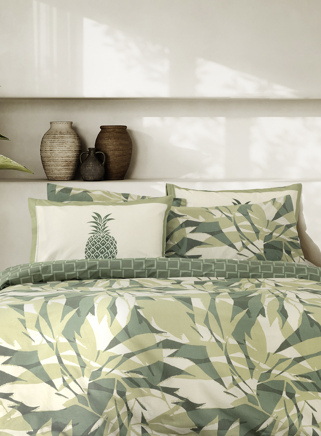 Τα βαμβακερά σεντόνια Cocomo αποπνέoυν φρεσκάδα, ζωντάνια και εξωτική ατμόσφαιρα. Το πλούσιο μοτίβο με τα τροπικά φύλλα, σε ποικίλες αποχρώσεις του πράσινου, από το λαδί έως το σμαραγδί, δημιουργούν μια αίσθηση βάθους και ενδιαφέροντος στο σχέδιο. Το κατωσέντονο έχει απλό γεωμετρικό μοτίβο σε πράσινη απόχρωση που αναδεικνύει ακόμα περισσότερο το μοτίβο του πανωσέντονου. Οι μαξιλαροθήκες του σετ είναι πάνελ με πράσινη περιμετρική μπορντούρα και κεντρικό μοτίβο με ανανά, που τονίζει τον εξωτικό χαρακτήρα του σχεδίου. Στρώστε το κρεβάτι σας με το σετ σεντονιών Cocomo, συνδυάζοντάς το με το ασορτί κουβερλί για να δώσετε ένα εξωτικό χαρακτήρα στην κρεβατοκάμαρά σας.
