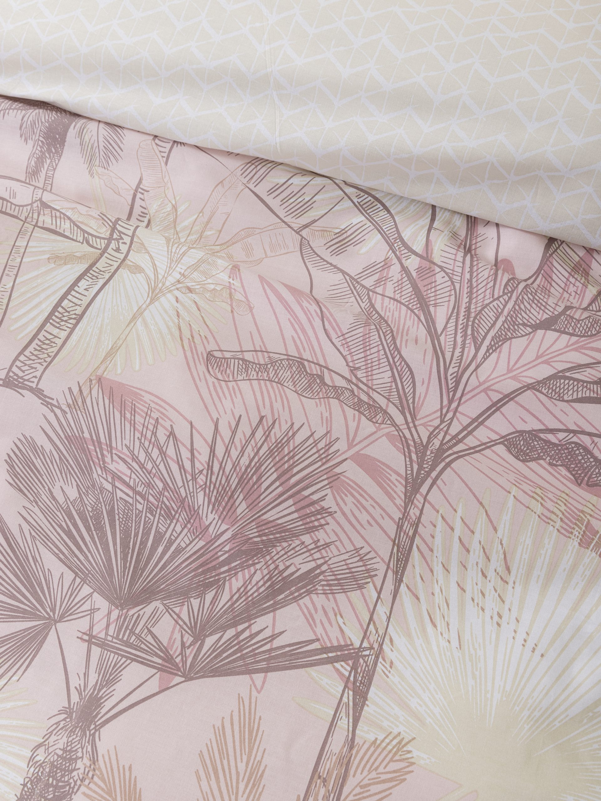 Τα βαμβακερά σεντόνια Curacao έχουν μοτίβα με φοίνικες που με την ρεαλιστική τους απεικόνιση, "φέρνουν" την αίσθηση της φύσης και της εξωτικής ομορφιάς στην κρεβατοκάμαρά σας. Το σχέδιο κινείται στην χρωματική παλέτα του ροζ, από τoν πιο ελαφρύ nude τόνο έως τον βαθύ τόνο του σάπιου μήλου, δημιουργώντας την ψευδαίσθηση τρισδιάστατης εικόνας. Έχει κατωσέντονο με λιτό γεωμετρικό μοτίβο, ενώ το ενδιαφέρον επικεντρώνεται στις ξεχωριστές πάνελ μαξιλαροθήκες του. Το κεντρικό μοτίβο των μαξιλαροθηκών είναι ένας φοίνικας σε παστέλ ροζ φόντο, που δημιουργεί ένα ενδιαφέρον οπτικό παιχνίδι και προσδίδει ένα ιδιαίτερο στυλ. Στρώστε το κρεβάτι σας με το σετ σεντονιών Curacao κάνοντας την κρεβατοκάμαρά σας ένα εξωτικό καταφύγιο.