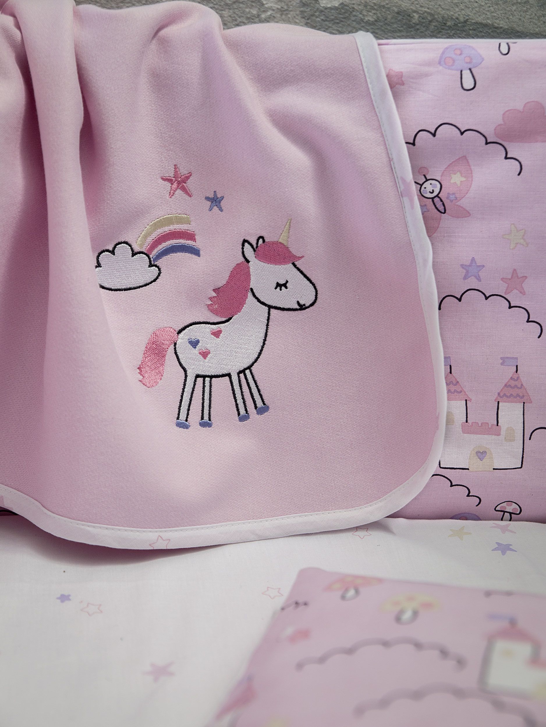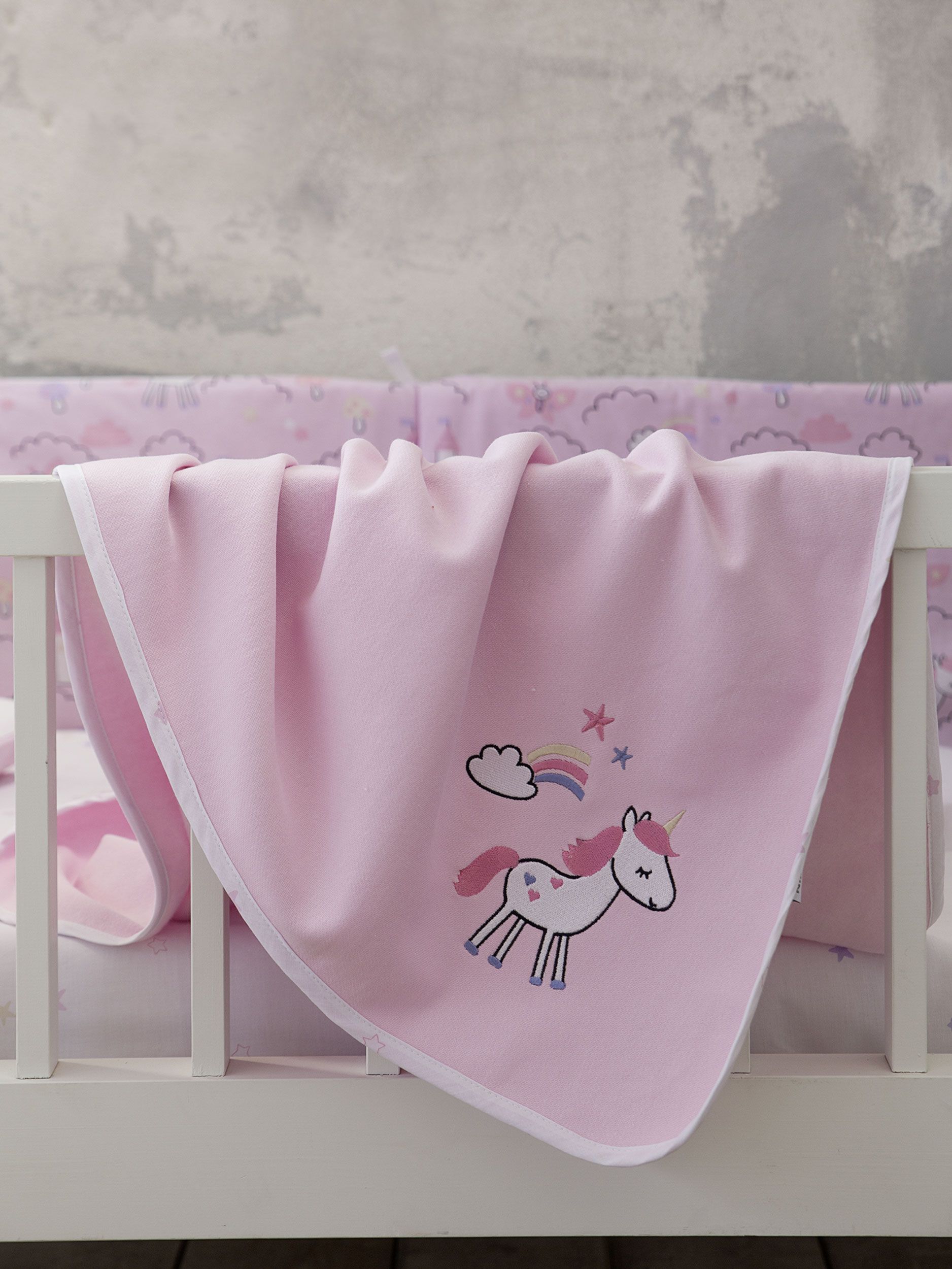 Η βρεφική κουβέρτα Magic Kingdom φέρνει τη μαγεία του παραμυθιού στο βρεφικό δωμάτιο. Έχει υπέροχο κεντητό σχέδιο με αλογάκια και ουράνια τόξα και απαλές ροζ αποχρώσεις. Ένα ρομαντικό σχέδιο που θα χαρίσει γλυκύτητα και ηρεμία στο βρεφικό δωμάτιο και θα το κάνει παραμυθένιο. Συνδυάστε τη με τα αντίστοιχα σεντόνια και πάντα κούνιας για ένα όμορφο αισθητικό αποτέλεσμα.