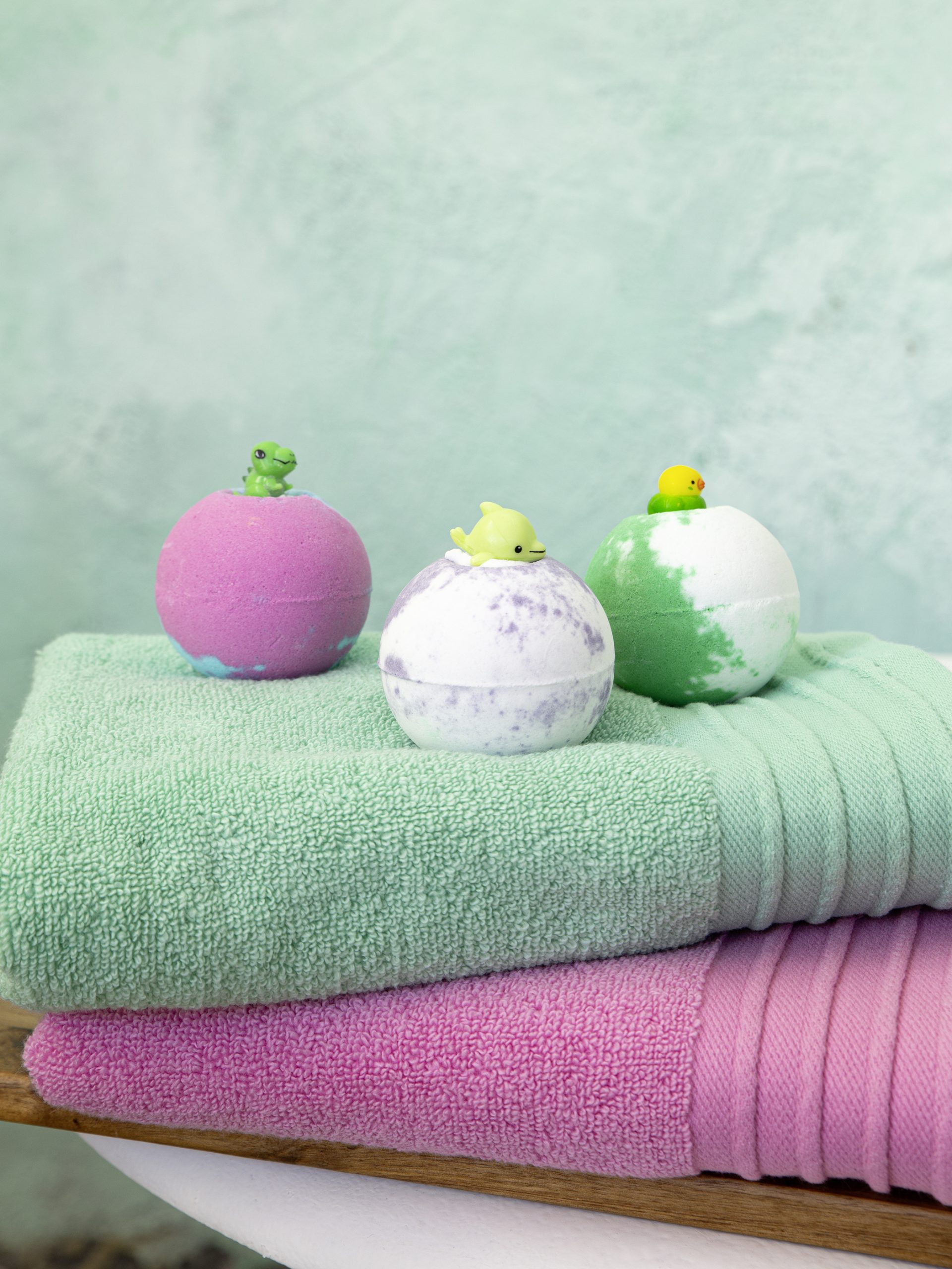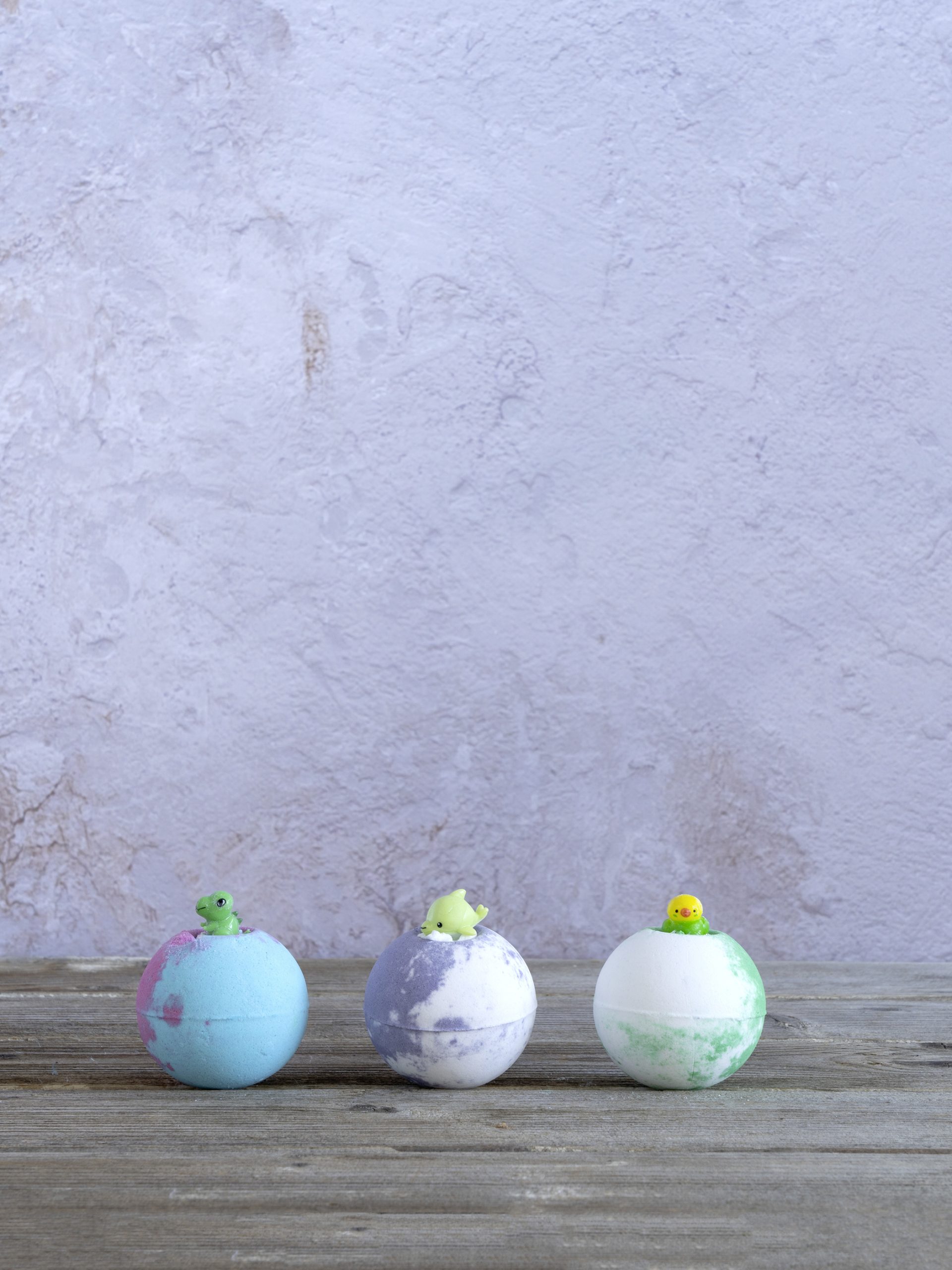 Αφρίζουσες μπάλες – bath bombs σε ένα πολύχρωμο σετ που θα ξετρελάνει τα παιδιά! Οι bath bombs αφρίζουν και κάνουν θόρυβο όταν έρθουν σε επαφή με το νερό και μεταμορφώνουν την ώρα του μπάνιου σε ώρα χαράς και διασκέδασης! Είναι ασφαλείς για την ευαίσθητη παιδική επιδερμίδα και για τις επιφάνειες της μπανιέρας. Θα χαρίσουν χαρά και γέλιο με τα χρώματα, τα υπέροχα αρώματα και με μια έκπληξη: έχουν επάνω τους μικρά χαριτωμένα παιχνιδοζωάκια που επιπλέουν στο νερό. Τα παιδιά θα ξετρελαθούν από τις φυσσαλίδες, το άρωμα και το παιχνίδι που φέρνουν στο μπάνιο. Οι Splish Splash bath bombs προσφέρονται σε σετ 3 τεμαχίων, σε όμορφη ανακυκλώσιμη συσκευασία, ιδανική για δώρο! Είναι κατάλληλες για παιδιά από 3 ετών και για χρήση με την επίβλεψη ενήλικα.