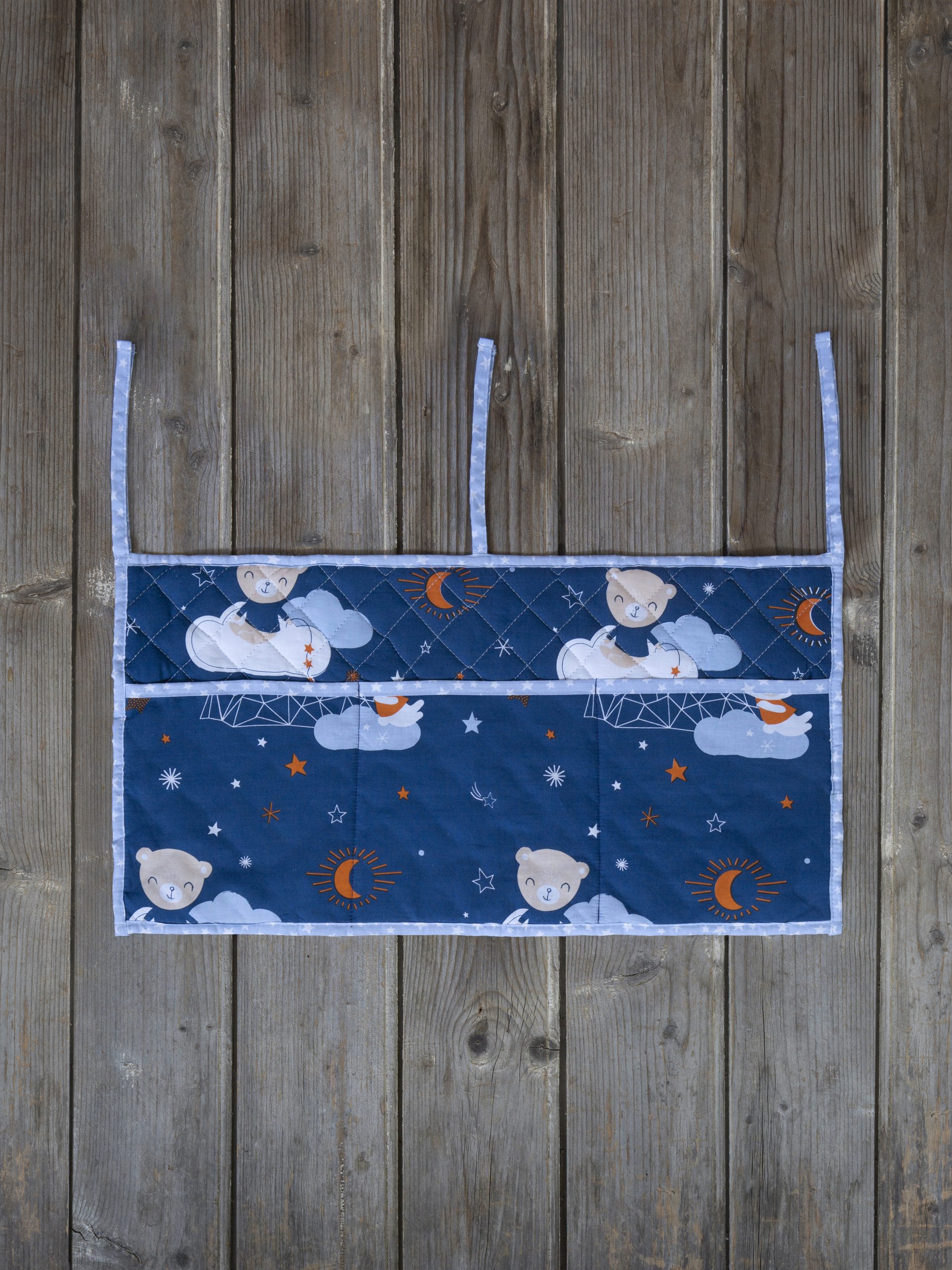 Η βρεφική θήκη οργάνωσης Nighty Night με το τυπωτό του σχέδιο που έχει χαριτωμένα αρκουδάκια και λαγουδάκια να "πετούν" στα σύννεφα, σε ένα σκουρο μπλε ουρανό, θα χαρίσει μια παραμυθένια διάθεση στο δωμάτιο του μωρού σας. Το παιχνίδι με το σκούρο μπλε και το γλυκό γαλάζιο χρώμα αποκτά ενδιαφέρον με την ένταση που δίνουν οι πορτοκαλί πινελιές του σχεδίου. Συνδυάστε τη με το σετ κούνιας Nighty Night για να δημιουργήσετε αρμονία στο βρεφικό δωμάτιο.