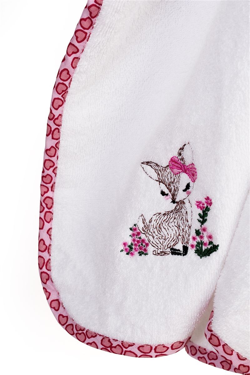 Βρεφική κάπα χρώματος λευκού διαστάσεων 75 x 85 cm, διακοσμημένη με χαριτωμένο κέντημα ελαφάκι και χρωματιστό ρέλι με μοτίβο καρδούλες. Κατασκευασμένη από 100% βαμβακερή υποαλλεργική πετσέτα υψηλής απορροφητικότητας, βάρους 400 gr/m² ελεγμένη για επιβλαβείς ουσίες με το παγκοσμίως αναγνωρισμένο πιστοποιητικό, OEKO TEX® Standard 100. Η απαλή υφή της προσφέρει την ιδανική φροντίδα, ενώ η ενσωματωμένη κουκούλα κρατάει το κεφαλάκι του μωρού ζεστό. Συσκευασία δώρου: κουτί πολυτελείας.