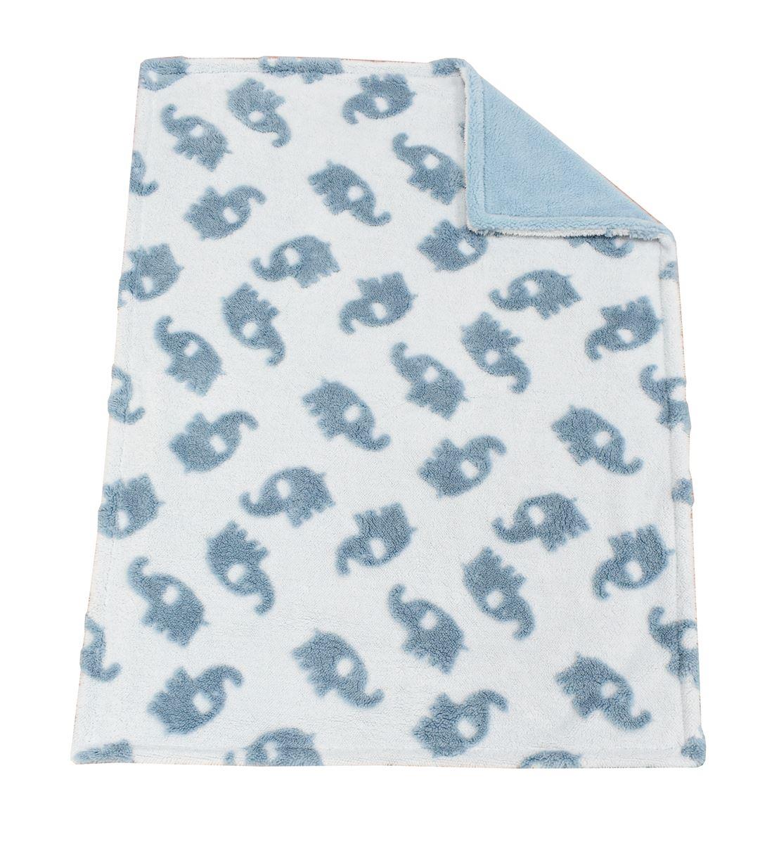 Κουβερτούλα διπλής όψεως με Sherpa 260 gr/m² με Jacquard σχέδιο με ελεφαντάκια, κατιονικής επεξεργασίας κάτι που καθιστά τα χρώματα της ανεξίτηλα, στην πάνω πλευρά και μονόχρωμη Sherpa 200 gr/m² στην κάτω πλευρά, διαστάσεων 75X100 cm. Οι δύο στρώσεις την καθιστούν πολύ ζεστή και ιδανική για την αγκαλιά, την κούνια και την βόλτα του μωρού σας, ακόμα και τους πιο κρύους μήνες του χειμώνα. Συσκευασία κορδελίτσα με καρτελάκι και κρεμάστρα.