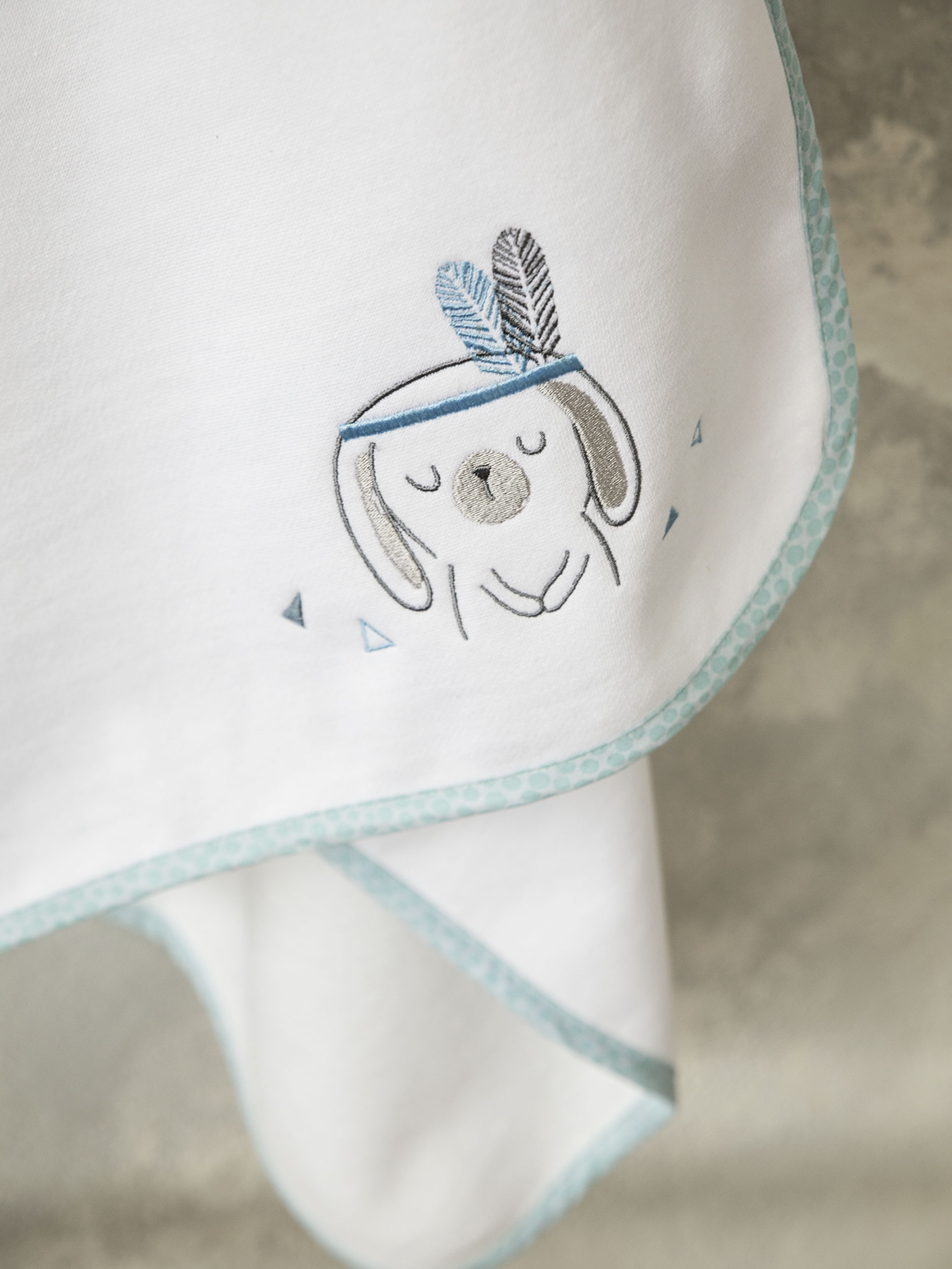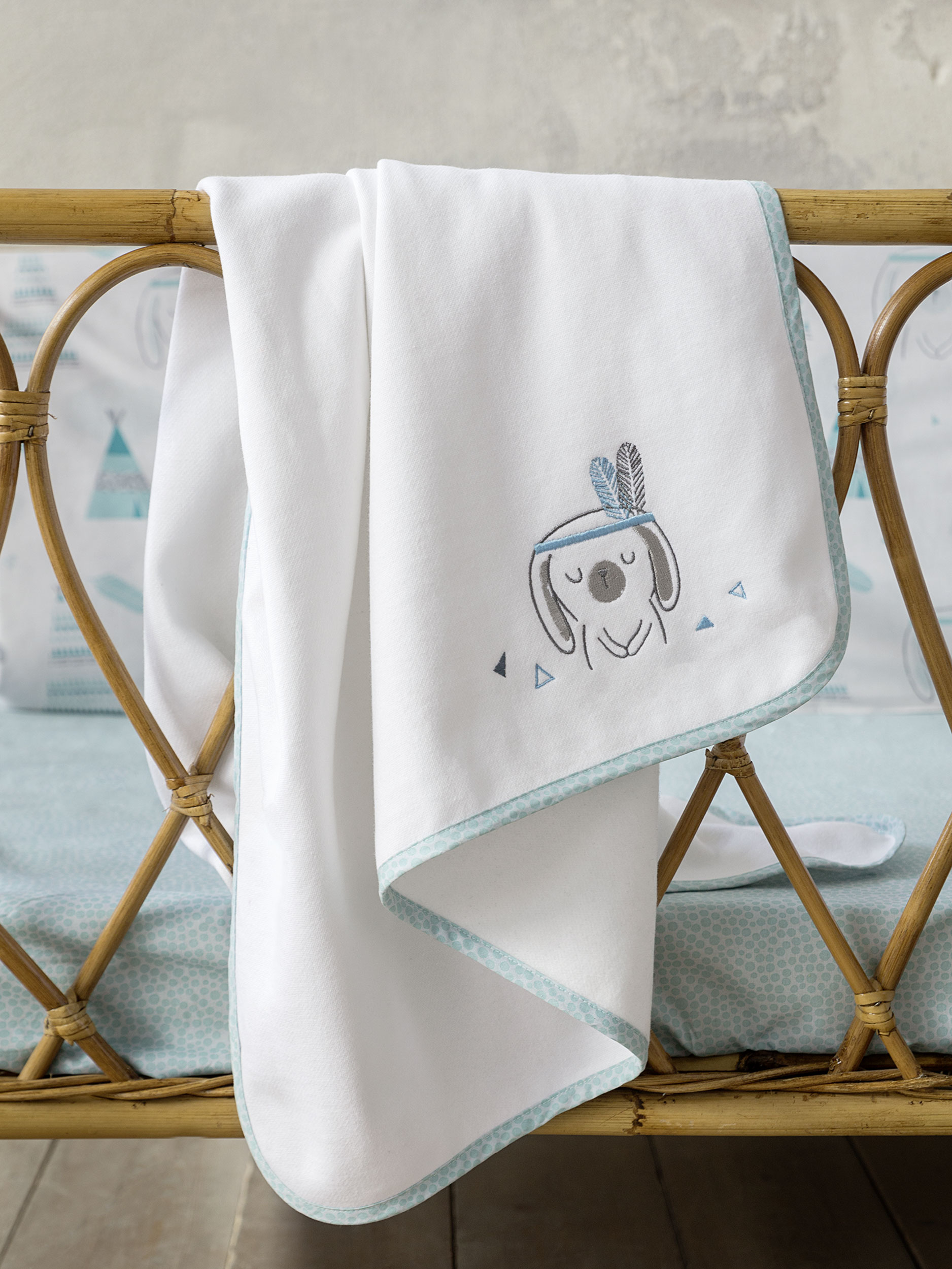 Η βρεφική κουβέρτα Little Indian έχει πανέμορφο κεντητό σχέδιο με κουνελάκι-ινδιανάκι, σε γλυκιές αποχρώσεις του πράσινου – βεραμάν επάνω σε λευκή βάση. Το χρώμα της γαλήνης και της ηρεμίας σε συνδυασμό με ένα σχέδιο που μοιάζει με μοντέρνα εικονογράφηση παραμυθιού, θα μεταμορφώσει το βρεφικό δωμάτιο σε έναν χώρο ιδανικό για τον ύπνο και τη χαλάρωση του μωρού σας. Το μωράκι σας μπορεί να κοιμάται ήσυχο παρέα με το κουνελάκι-ινδιανάκι που θα συντροφεύει τα όνειρά του και τις ώρες παιχνιδιού. Συνδυάστε τη με το αντίστοιχο σετ κούνιας για ένα όμορφο αισθητικό αποτέλεσμα.