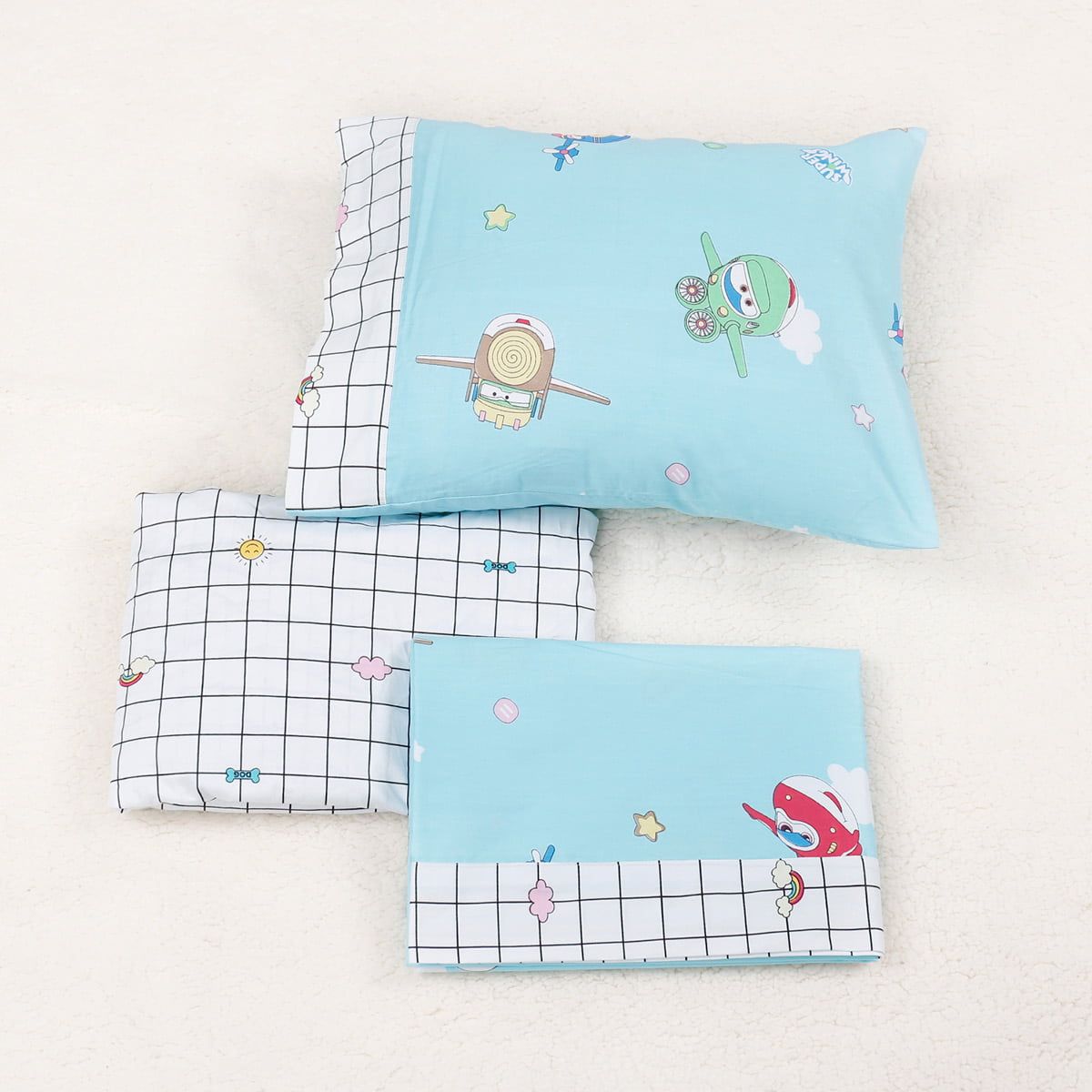 Το σετ περιλαμβάνει 1 τεμάχιο πανωσέντονο σε διάσταση 120x160, 1 τεμάχιο κατωσέντονο με λάστιχο σε διάσταση 70x140+15 και 1 τεμάχιο μαξιλαροθήκη σε διάσταση 35x45.