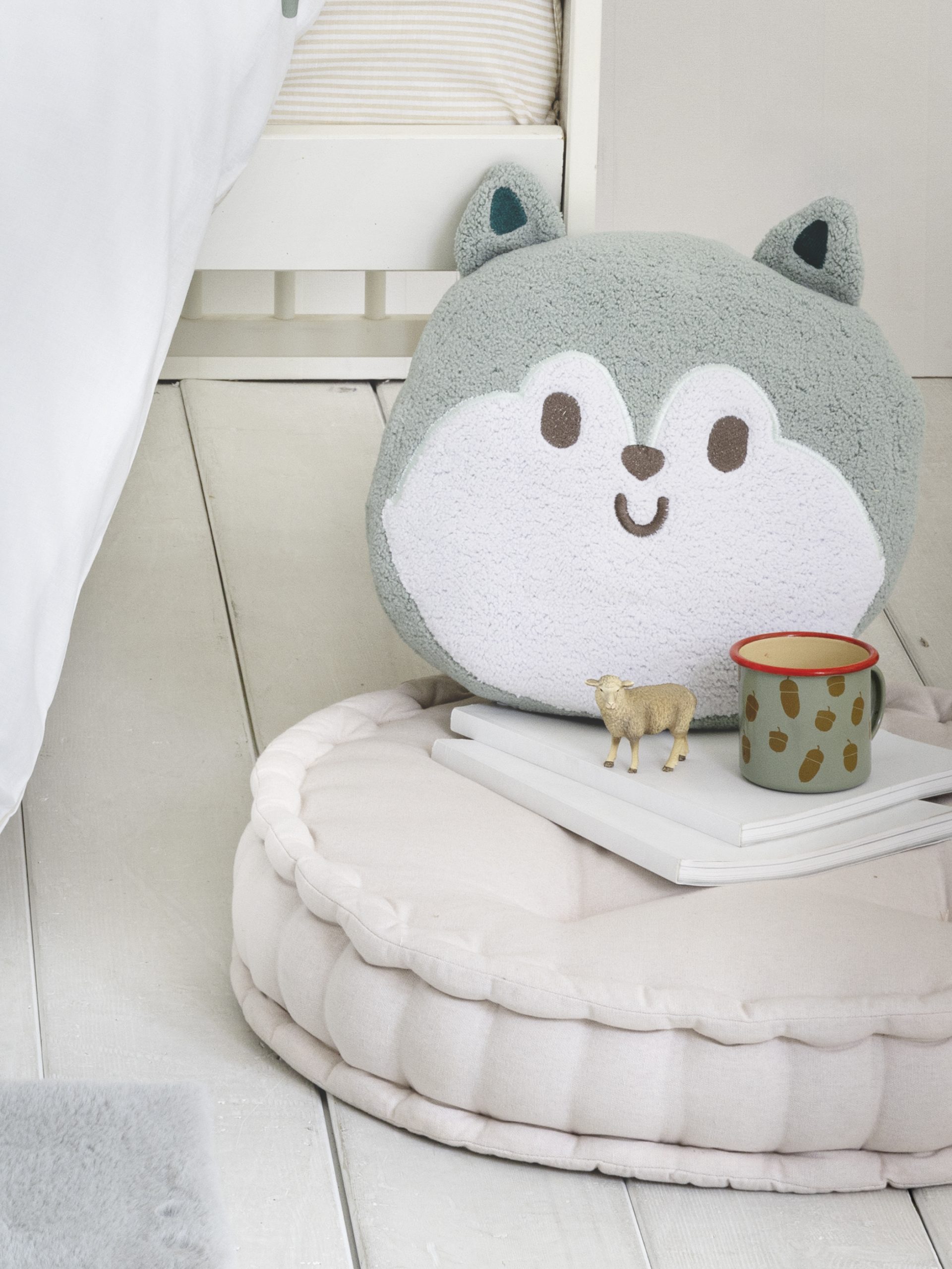 Το διακοσμητικό μαξιλαράκι Woolfy είναι ιδανικό για να προσθέσει μια παιχνιδιάρικη και γλυκιά ατμόσφαιρα στο δωμάτιο του παιδιού σας. Σε σχήμα μικρού ζώου, με απαλές, γήινες αποχρώσεις γκρι και λευκού, αποπνέει ζεστασιά και χαρά. Το χαμογελαστό πρόσωπο του ζώου, μαζί με τα αυτιά που προεξέχουν, το κάνουν ακόμα πιο χαριτωμένο και ελκυστικό για τα παιδιά. Το υλικό του είναι απαλό στην αφή, ιδανικό για αγκαλιές, ενώ το μέγεθός του είναι κατάλληλο για να χρησιμοποιηθεί τόσο για παιχνίδι όσο και για διακόσμηση. Μπορεί να τοποθετηθεί σε κούνιες, κρεβάτια ή ακόμα και σε παιδικές γωνιές για να προσθέσει μια τρυφερή και παιχνιδιάρικη νότα στο χώρο.